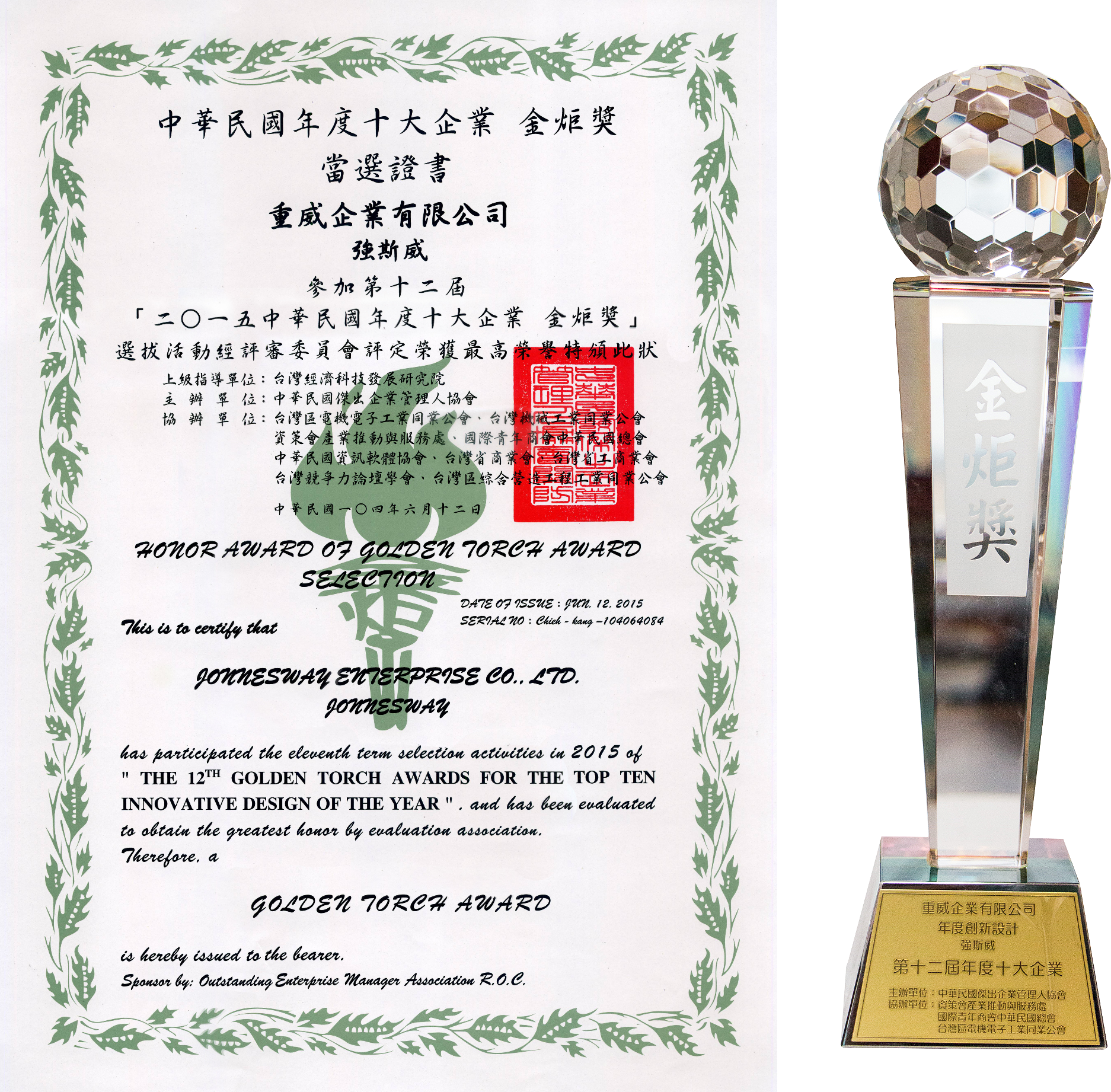 JONNESWAY received the 2015 12th Golden Torch Award by outstanding Enterprise Manager Association Vice President of Taiwan Mr. Wu Don-Yih gave award to Jonnesway.