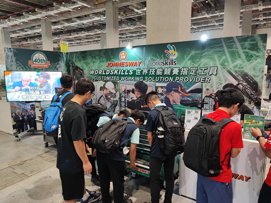 As one of the main sponsors of Transportation and Logistics, we can set up a booth for advertising. Our main booth is next to the Autobody Repair competition area, displaying the trolleys with customized tool sets for the sponsored skills, 2 for Automobile Technology, general service and electric car service, 1 for Autobody Repair and 1 for Refrigeration and Air Conditioning. Besides, in the Electric Vehicle introduction area, Jonensway's trolley with insulation tool sets was also displayed with the posters of the world champion of Automobile Technology in 2022, the competitor Jonnesway sponsored.