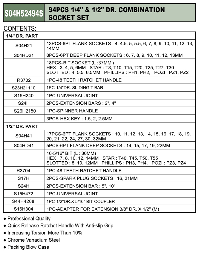 94 PCS 1/4" & 1/2" DR. COMBINATION SOCKET SET
