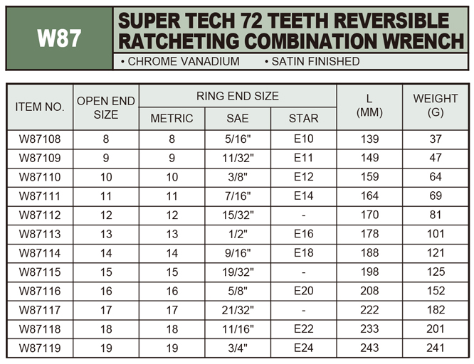 SUPER TECH 72 TEETH REVERSIBLE RATCHETING COMBINATION WRENCH