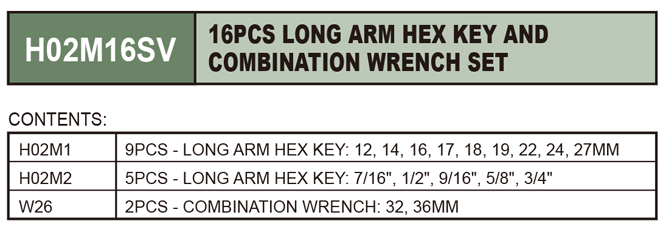 16PCS LONG ARM HEX KEY AND COMBINATION WRENCH SET