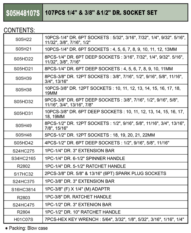 107PCS 1/4" & 3/8"& 1/2" DR. SOCKET SET