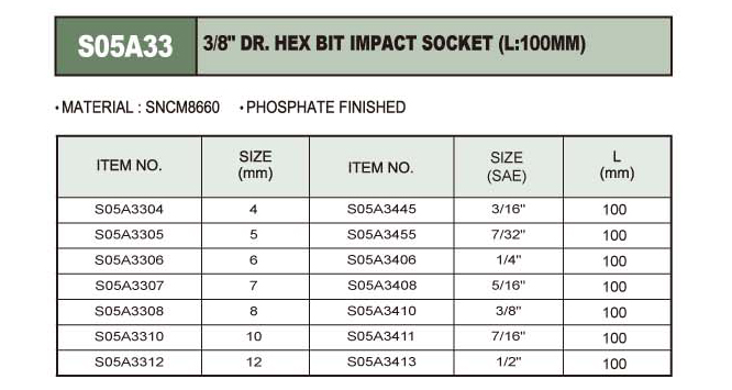 3/8" DR.HEX BIT IMPACT SOCKET (L:100MM)