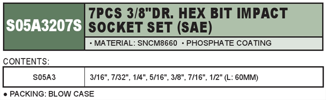 7PCS 3/8" DR. HEX BIT IMPACT SOCKET SET (SAE)