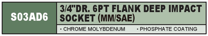 3/4" DR. 6PT FLANK DEEP IMPACT SOCKET (MM/SAE)