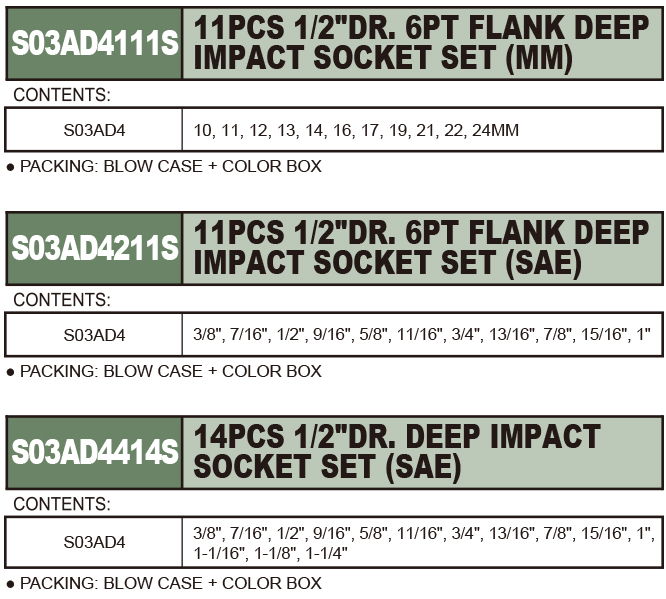 1/2"DR. 6PT FLANK DEEP IMPACT SOCKET SET
